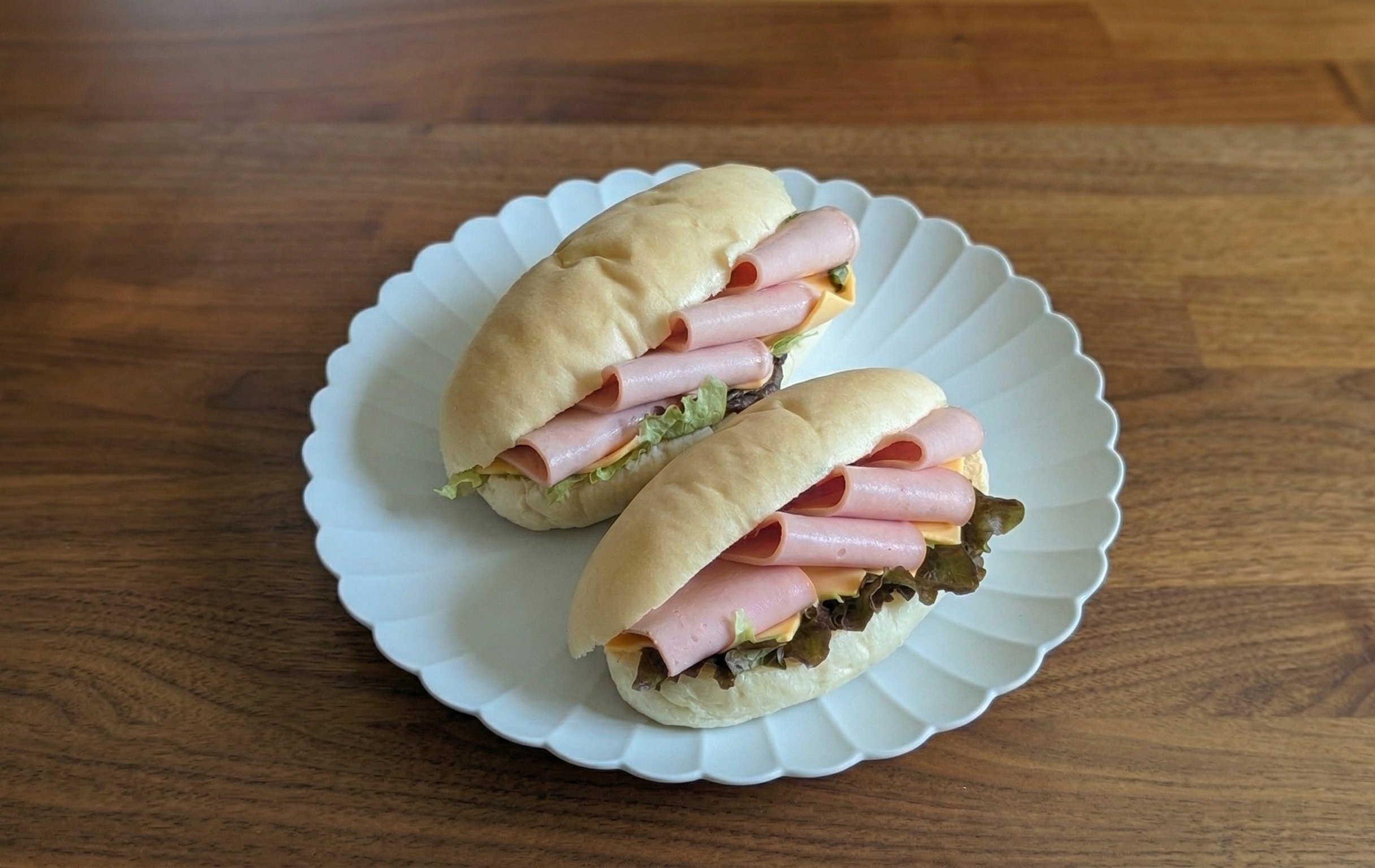 朝食にぴったりのハムとチーズ、シャキシャキのレタスを、ふんわりしっとりとした天然酵母のコッペパンで挟んだ、人気の商品です。